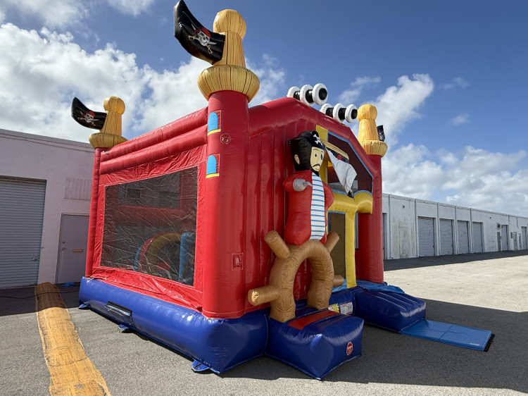 Set sail for adventure with this bright, bold pirateβthemed combo! With a giant pirate at the helm, a shipβwheel front, and a builtβin slide, this inflatable turns any event into a highβenergy treasure hunt.