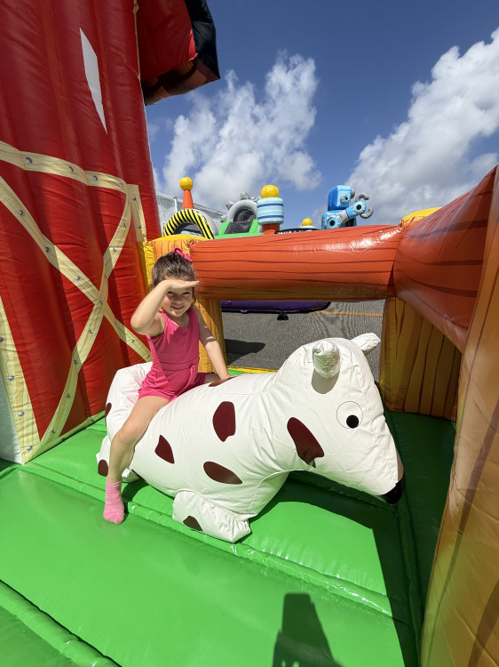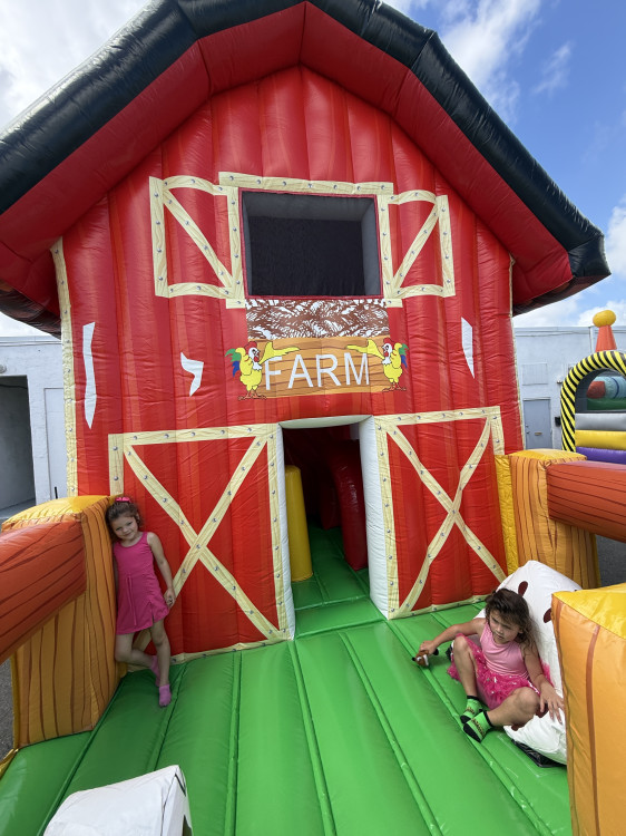 This isn’t just a bounce house—inside the barn, kids can bounce and slide, then discover a secret back door that leads into a hidden cylindrical tunnel area for even more adventure.