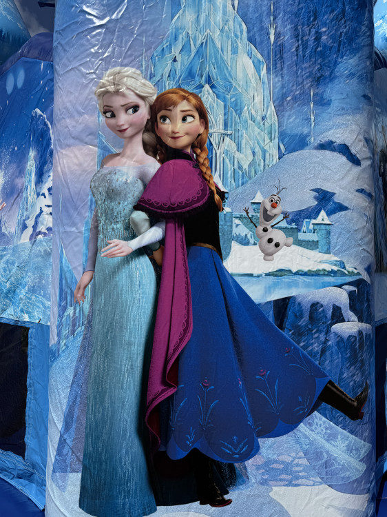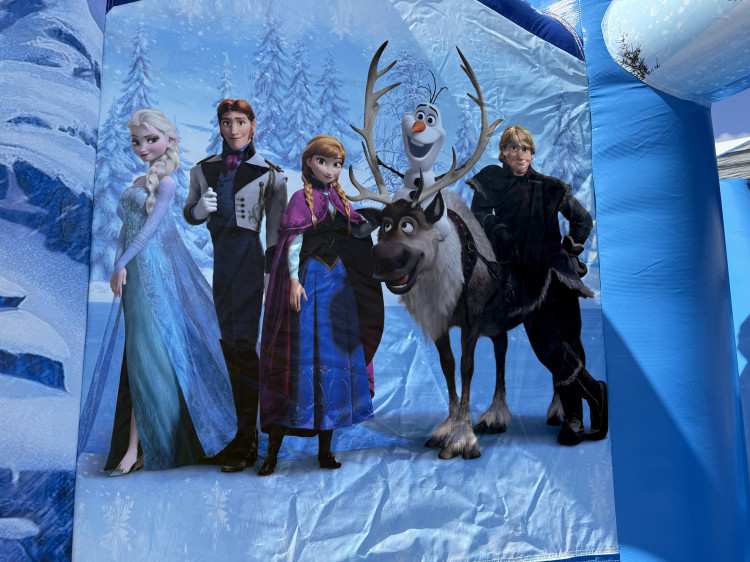 Kids can bounce, climb, slide, and explore inside a beautifully detailed winter castle that feels straight out of the movie.